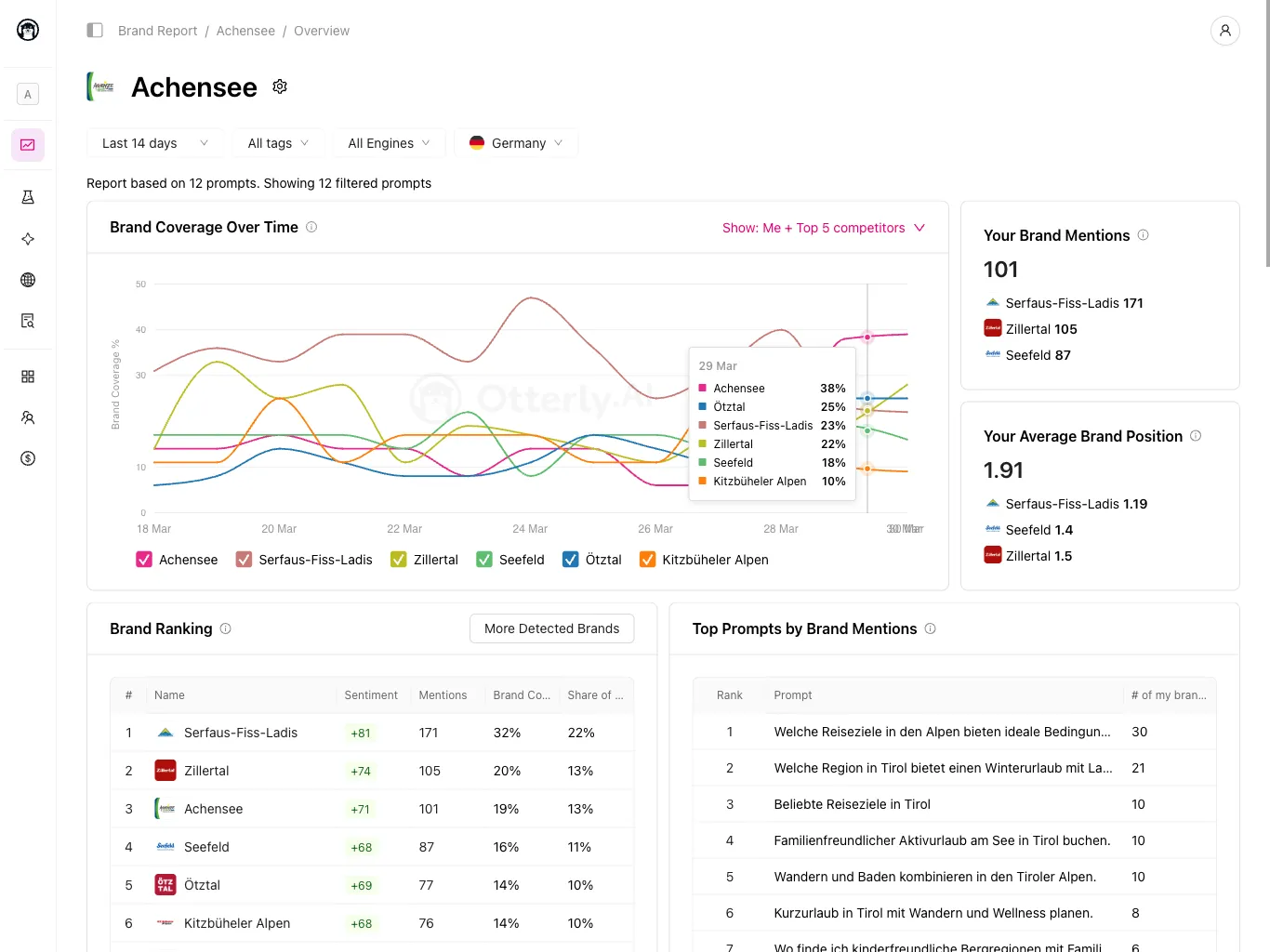Ganzheitliche Synergien: Otterly.ai macht die Zusammenhänge zwischen SEO, GEO, PR und Social Media sichtbar. Erkennen, wie verschiedene Kanäle zusammenwirken und die Marke Achensee in die KI „spülen“.