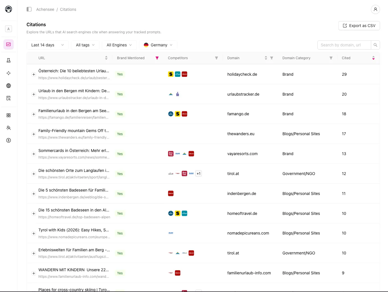 Einblick in die Brand Coverage: Verfolgung der positive Entwicklung der Markenerwähnungen in KI-Portalen; wie präsent ist der Achensee in relevanten Urlaubsszenarien.