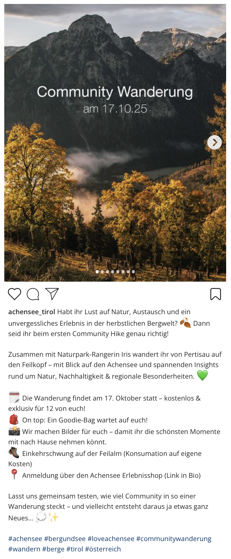 Im Rahmen der Taktvoll-Initiative organisierte Achensee Tourismus die erste Community-Wanderung am Feilkopf. Ziel war es, Naturerleben, Achtsamkeit und Austausch in den Mittelpunkt zu stellen – als Teil der laufenden Maßnahmen zur Bewusstseinsbildung im Umgang mit der sensiblen alpinen Umgebung.