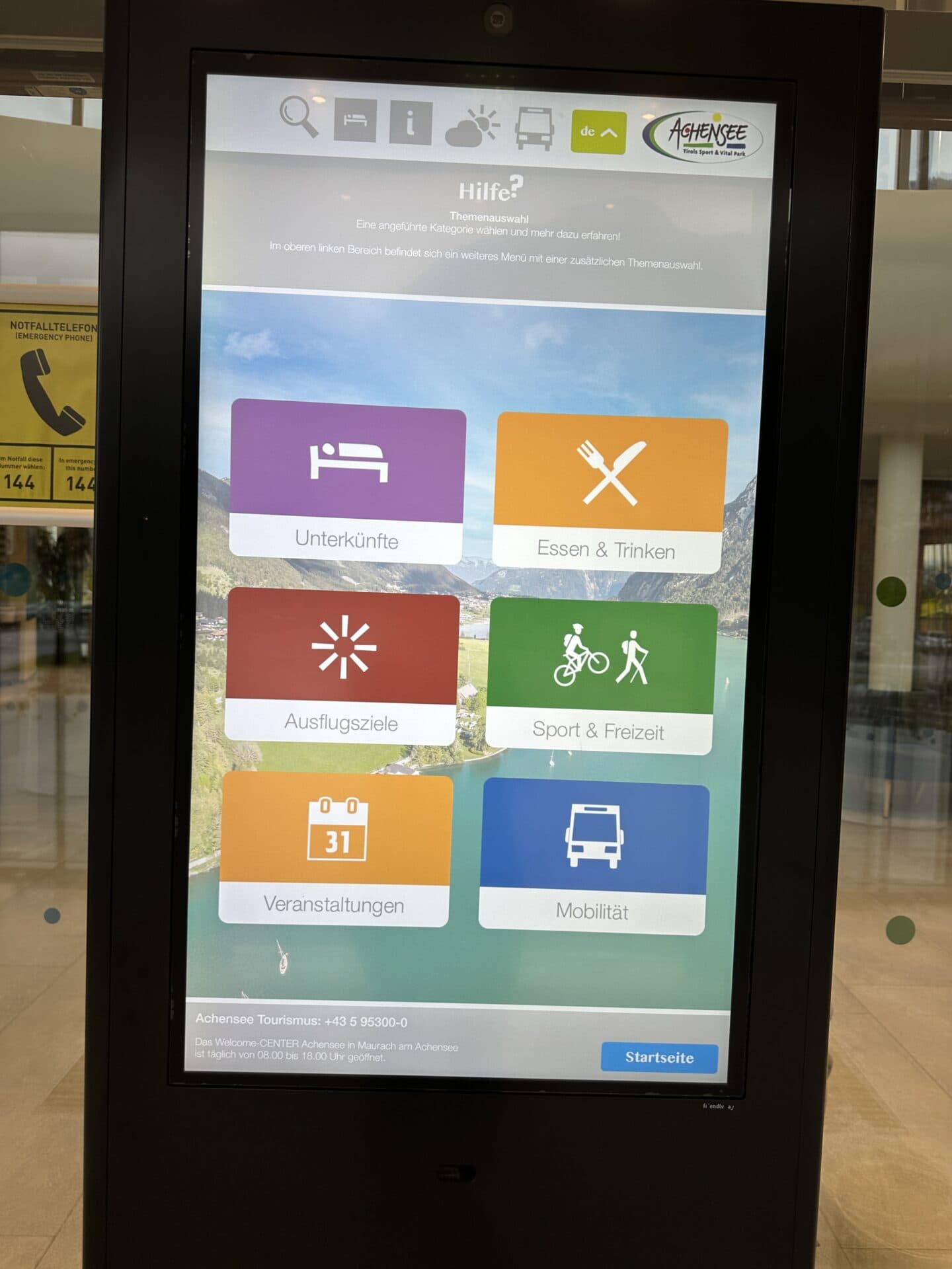 Sieben moderne Infoterminals – verteilt auf zentrale Standorte in der Region – bieten Gästen eine benutzerfreundliche Orientierungshilfe. Ob indoor oder outdoor: Jeder Terminal spielt standortbezogene Inhalte aus und erleichtert so die direkte Verortung.