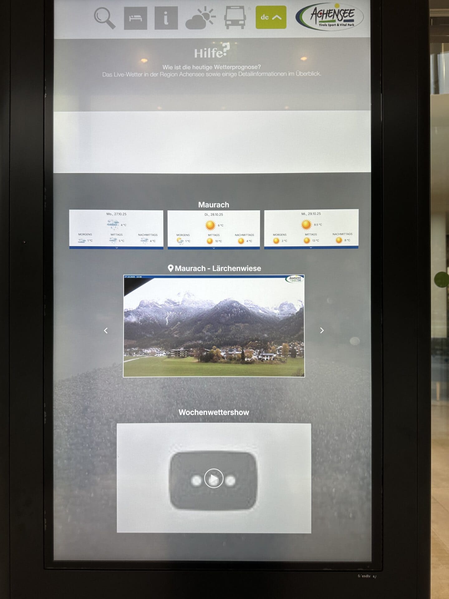 Die Geräte bieten eine kompakte Übersicht über Informationen zur Region. Abrufbar sind z.B. Live-Wetterdaten, Schnee- und Loipenberichte, Wanderrouten, Skipisten, Ausflugsziele oder auch Öffnungszeiten von Restaurants und Sehenswürdigkeiten – je nach Standort unterschiedlich. Die Inhalte sind auf die Bedürfnisse der Nutzer vor Ort abgestimmt.